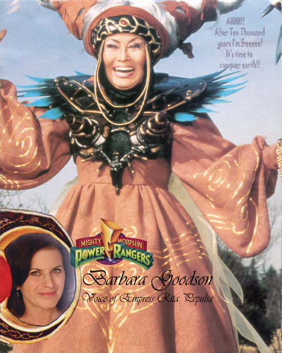 Barbara Goodson is an American voice actress who has done voice-over work in cartoons and shows. Her best-known role was providing the English dub voice of the main villain Empress Rita Repulsa in the Power Rangers franchise, starting with Mighty Morphin Power Rangers, and including Power Rangers Zeo, Turbo: A Power Rangers Movie, and Power Rangers in Space. Other Power Rangers characters she has played include Prince Sprocket and Orbus in Power Rangers Zeo, and Mandilok in Power Rangers Wild Force. She also voiced Red Fraggle and Wingnut in Jim Henson’s cartoon Fraggle Rock, Ladyborg in Beetleborgs Metallix, and Mother Talzin on Star Wars: The Clone Wars, the last of which she won a Best Actress award from the website Behind The Voice Actors. She also voiced in HBO’s Adventures of Tom Sawyer as Tom and FLCL as Naota. For her work in the series CloudBread, in which she is a cast member as Wooley, Ruiz, Grandma, and Teacher Ellie, she was nominated for Best Children’s Programming in 2011 for an Annie Award. She was also awarded an Earphones Award for narrating Blair Clemons in the Time/Warner book On A Night Like This.